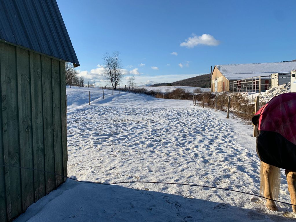 One of our front paddocks during the winter. All paddocks include sheltered stalls that the horses can use at their choosing.